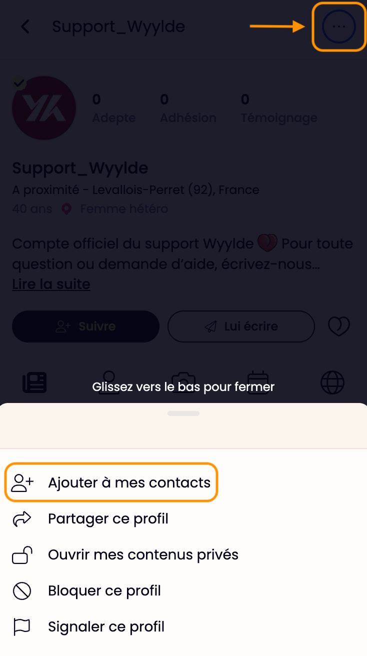 Pour ajouter le profil d’un membre à vos contacts, cliquez sur les trois points situés en haut à droite de son profil.