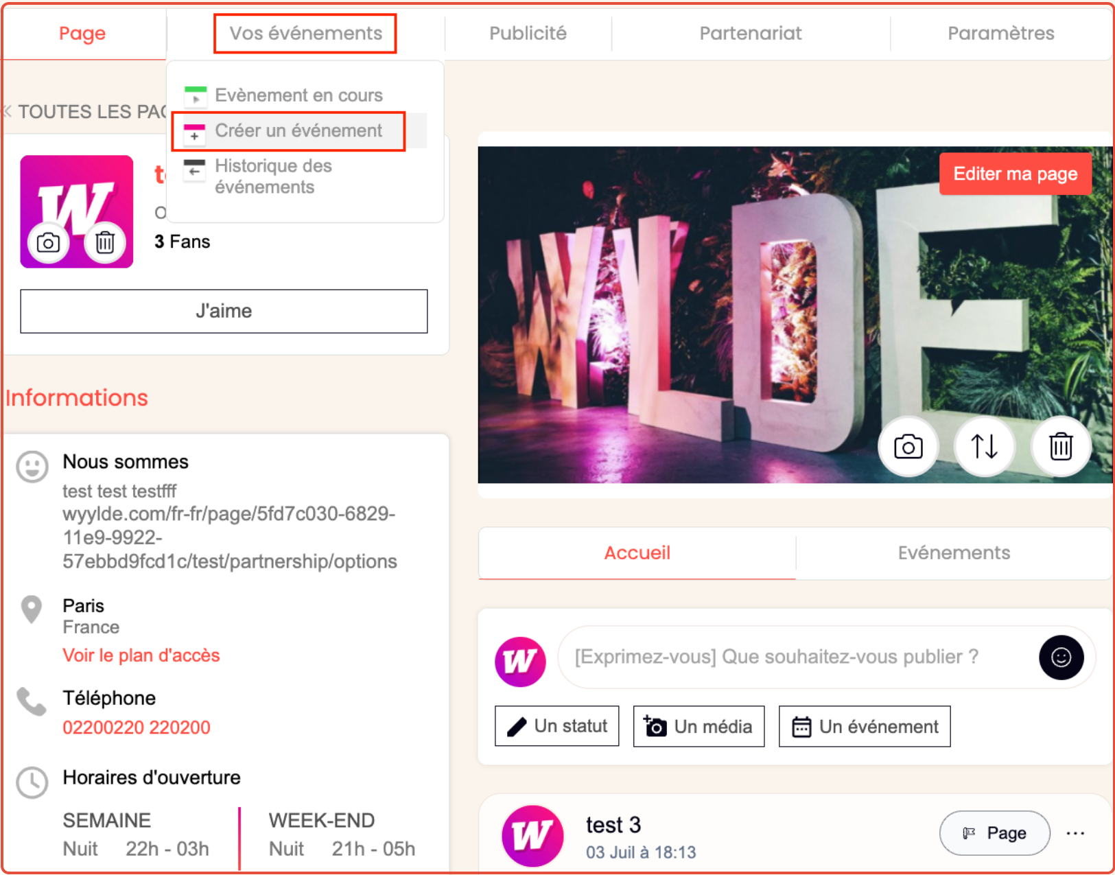 Les événements organisés par des professionnels doivent être créés depuis votre page, et non depuis la rubrique événement du site. Retrouvez ici les explications afin de pouvoir vous rendre sur votre page.