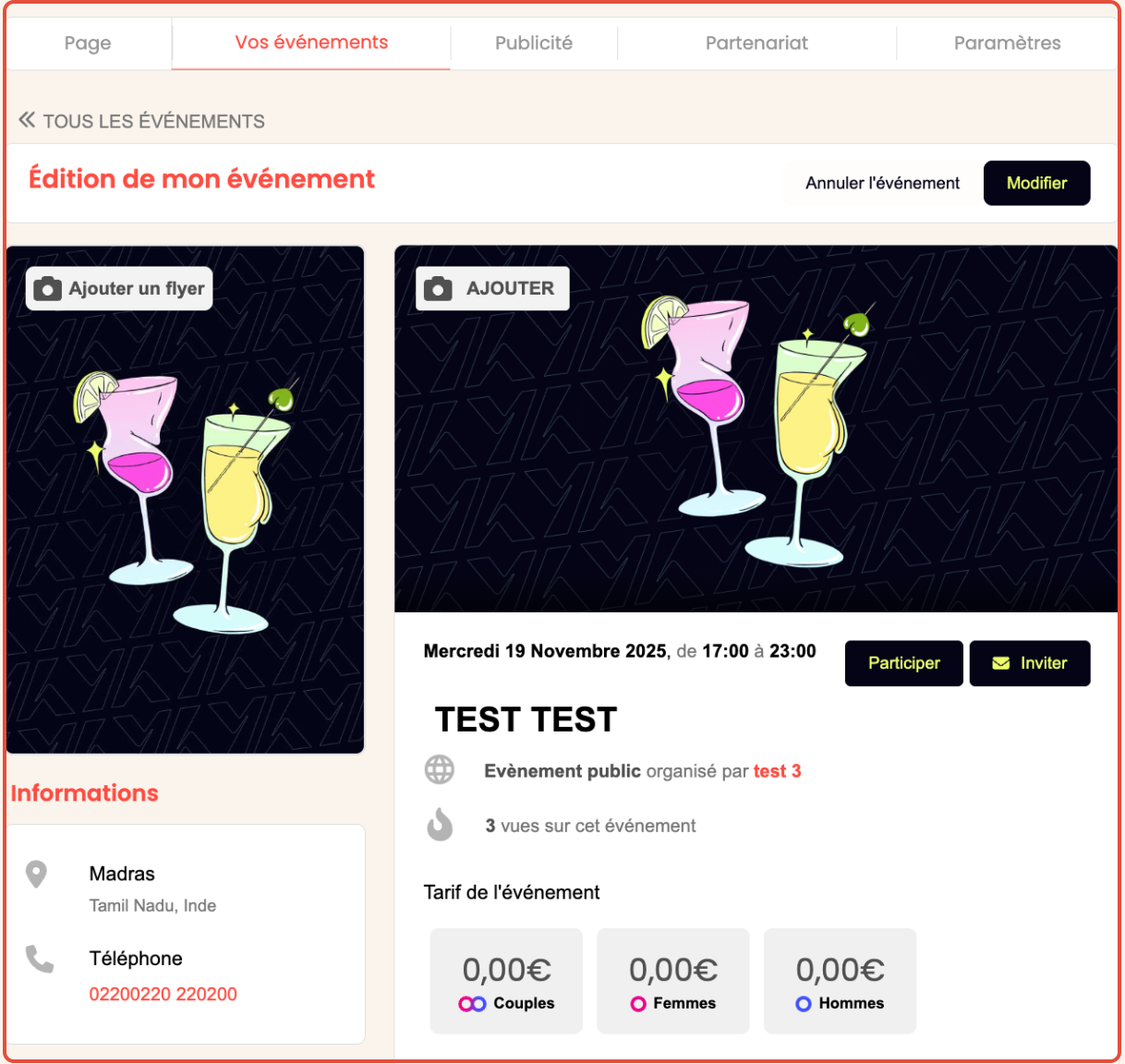 Une fois les détails de l'événement renseignées, et après validation, vous serrez renvoyé à la page de votre événement vous laissant la possibilité de le personnaliser en ajoutant un flyer et/ou une photo de couverture.