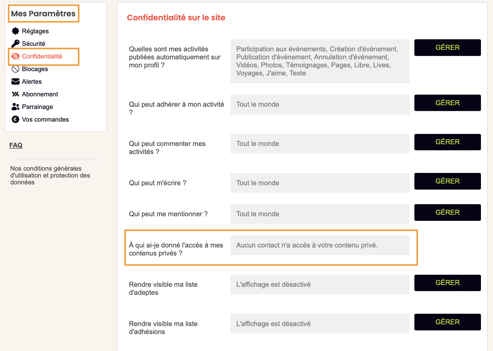 Pour accéder à la liste des ouverture de contenus privés, vous pouvez vous rendre dans vos paramètres directement.