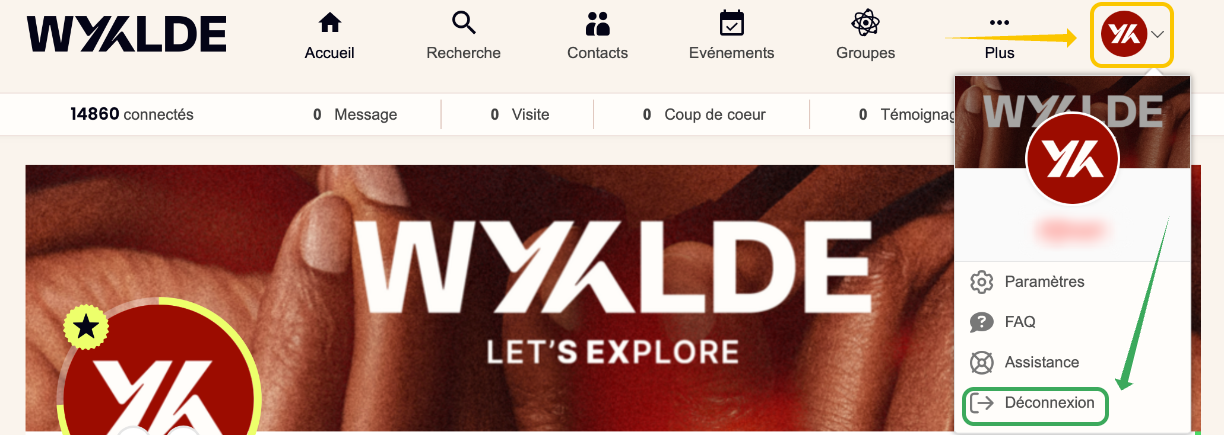 Rendez-vous dans votre espace Wyylde, cliquez sur votre icône/photo de profil en haut à droite, puis choisissez "Déconnexion".