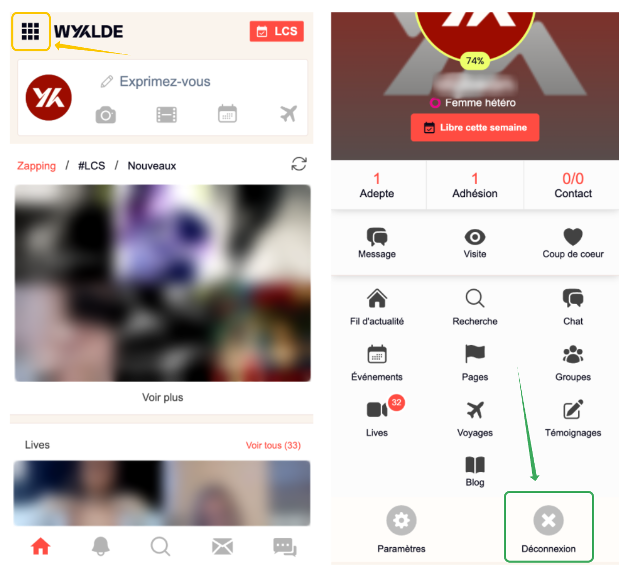Rendez-vous dans votre espace Wyylde, cliquez sur l'icône carré en haut à gauche, puis descendez en bas de la page et choisissez "Déconnexion".
